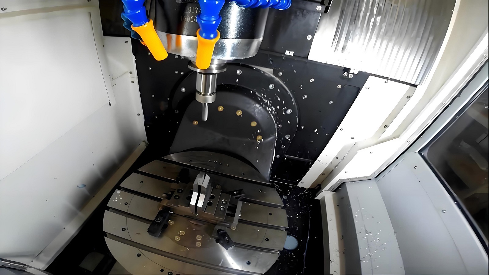 四軸加工中心:通過增加的旋轉軸,可以實現自動分度打斜孔、銑斜邊等功能,提高了自由空間曲面的精度、質量和效率。但對于一些復雜的空間曲面和倒扣、深腔等結構,四軸加工中心可能無法一次裝夾完成加工。