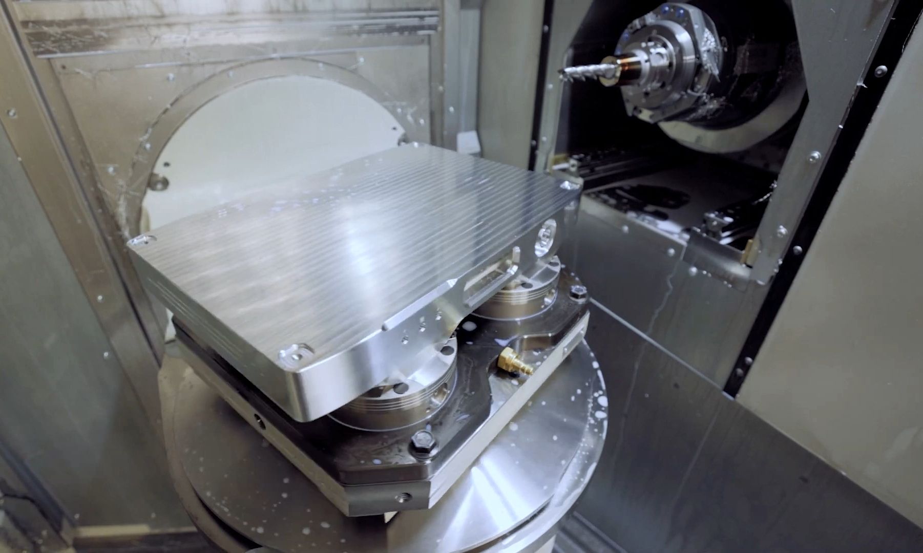 傳統五面加工依賴“3軸主軸+2軸轉臺”的串并聯結構,而新一代設備采用“搖籃式轉臺+雙擺角頭”的復合架構,實現空間六自由度聯動。例如,德國德瑪吉五面加工中心,其A/C軸擺角頭可覆蓋±110°/±360°的加工范圍,配合±0.001°的旋轉精度,在加工航空發動機整體葉盤時,單次裝夾即可完成葉片型面、輪轂及流道的五面聯動加工,較傳統工藝效率提升40%,且葉型輪廓度誤差控制在0.015mm以內。