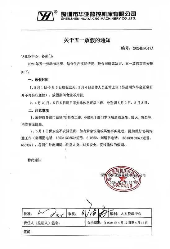 深圳市華亞數控機床有限公司關于五一放假的通知
